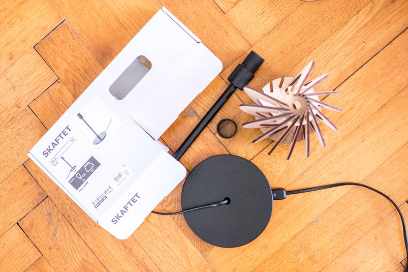 Das, was ich am meisten an meiner Arbeit liebe, ist es immer wieder Neues zu kreieren und Ideen umzusetzen. Schon lange spukt diese Vorstellung in meinem Kopf, meine Holzlampenschirme mit Metallelementen zu kombinieren, um ihnen einen besonderen Style zu verleihen. Wie würden meine Lampenschirme wohl auf einem Tisch- oder Stehleuchtenfuß aus Stahl oder Messing zur Geltung kommen? So nutzte ich die ruhige Zeit um mir Gedanken um eine mögliche Umsetzung zu machen und entdeckte beim Stöbern im Ikea den Tischleuchtenfuß Skaftet. Dieser schien mir mit seiner schlichten Form und seiner matt schwarz beschichteten Stahloberfläche perfekt zu sein, um ihn mir für meine Zwecke nutzbar zu machen.