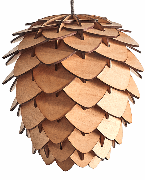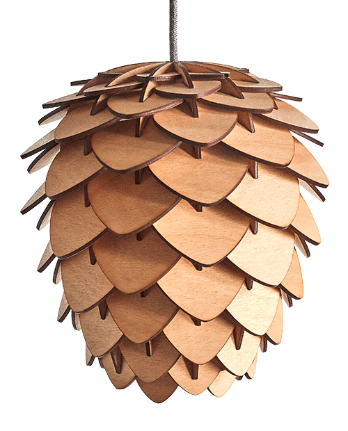 The Cone brings striking yet soft, indirect light along with some of nature’s inspiration into any room. Constructed from 78 individual wood leaves, the light source can stand alone as sculpture or unique feature in decor. The Cone can be mixed and matched in various ways depending on the space it hangs, in order to create enough light to function. It works as a set of three smaller light fixtures together or as a larger single piece.
