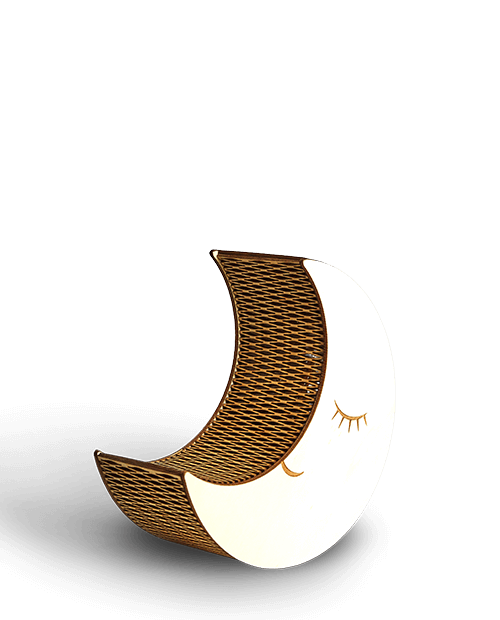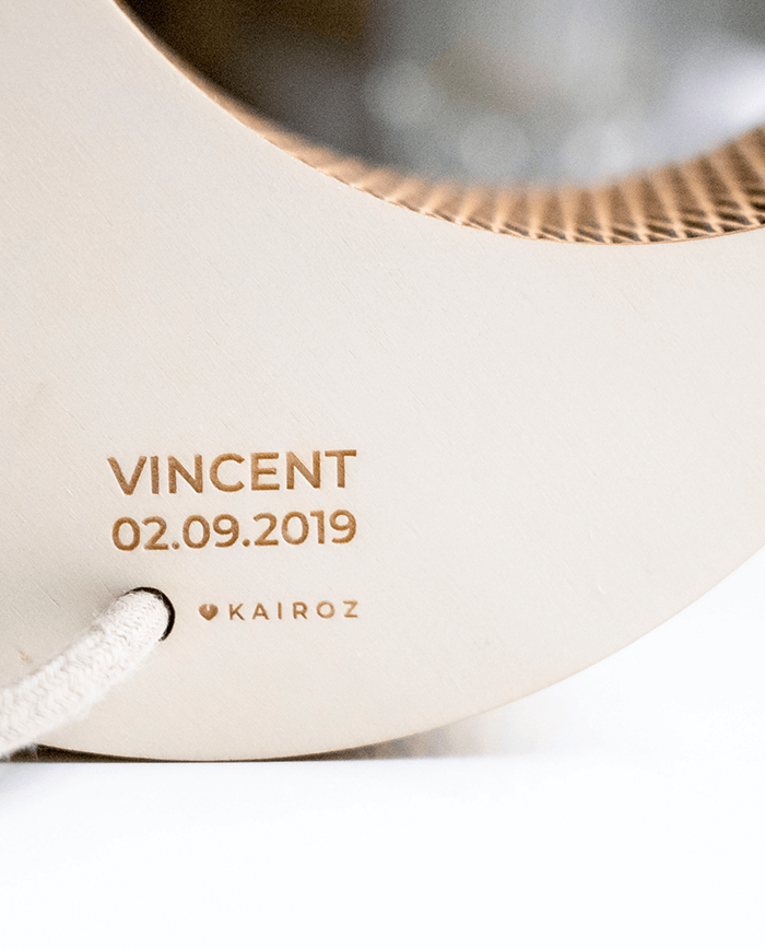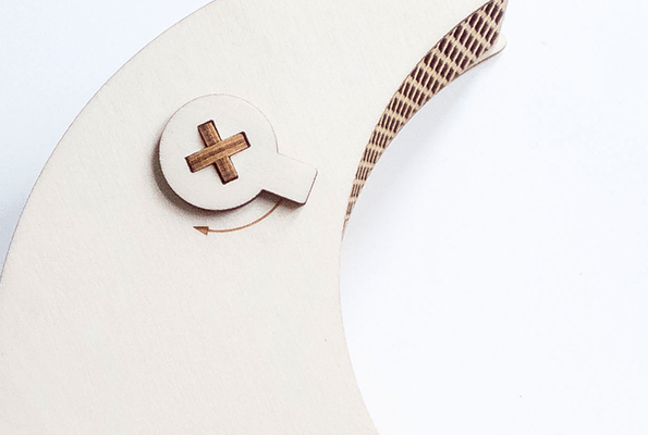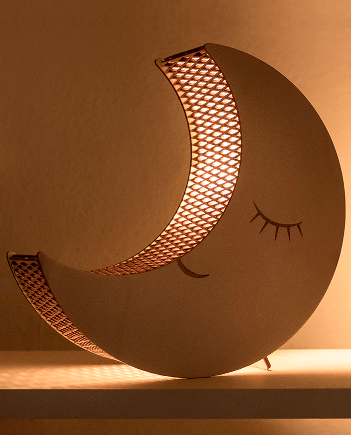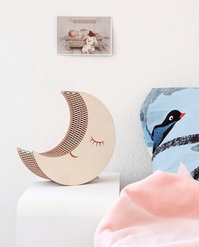 Der Moon vertreibt als Nachtlicht für Kinder mit seinem sanften, warmen Licht die Angst vor der Nacht und vielleicht sogar die Monster unter dem Bett. Gestaltet mit der Living Hinge Technik – durch das eingeschnittene Muster wird das Holz biegsam. Mit individueller Gravur, z.B. Name, Geburtsdatum, Geburtszeit, Gewicht. Die Leuchte wird fertig zusammengebaut geliefert.